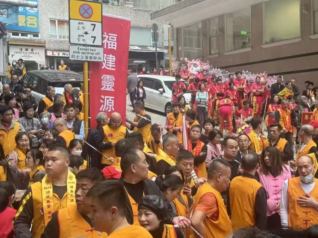 佛祖起駕,巡安祈福,由800餘人組成的巡安隊伍浩蕩啟程,成為當日最耀眼的盛景。隊伍以“鳴鑼開道”“肅靜”“回避”等傳統儀仗引領,香港福建興源寶慶度排子吹樂團奏響悠揚樂聲,30只獅隊騰躍起舞,或搖頭擺尾,或登高采青,靈動活潑;龍隊蜿蜒前行,鱗爪飛揚,氣勢磅礴。旗袍隊身著錦繡華服,步態溫婉;蓮花燈隊手托明燈,微光閃爍;紅燈籠隊高舉燈籠,暖意融融,各方陣依次跟進,井然有序。四海情緣南音采球隊、香港古盈同鄉會南音社等團體獻上特色南音展演,弦歌不輟,古韻悠長。信眾手持康乃馨與清香,虔誠護持著靈源佛祖八座聖轎緩緩前行,轎身雕樑畫棟,流光溢彩。沿途信眾合十致意,“觀音悲願周沙界,弟子同心向涅槃”,萬眾一心的虔誠,讓禪心與鄉情在香江畔交融。