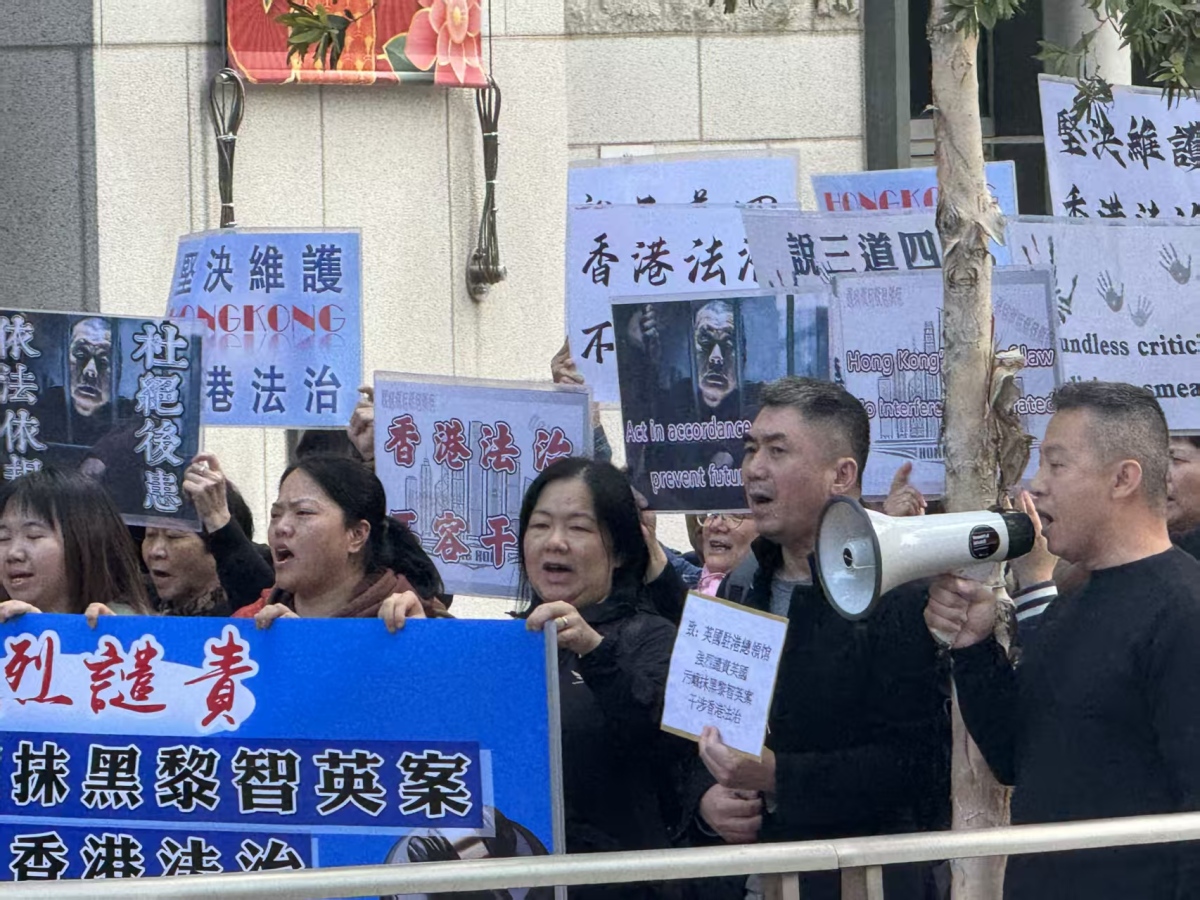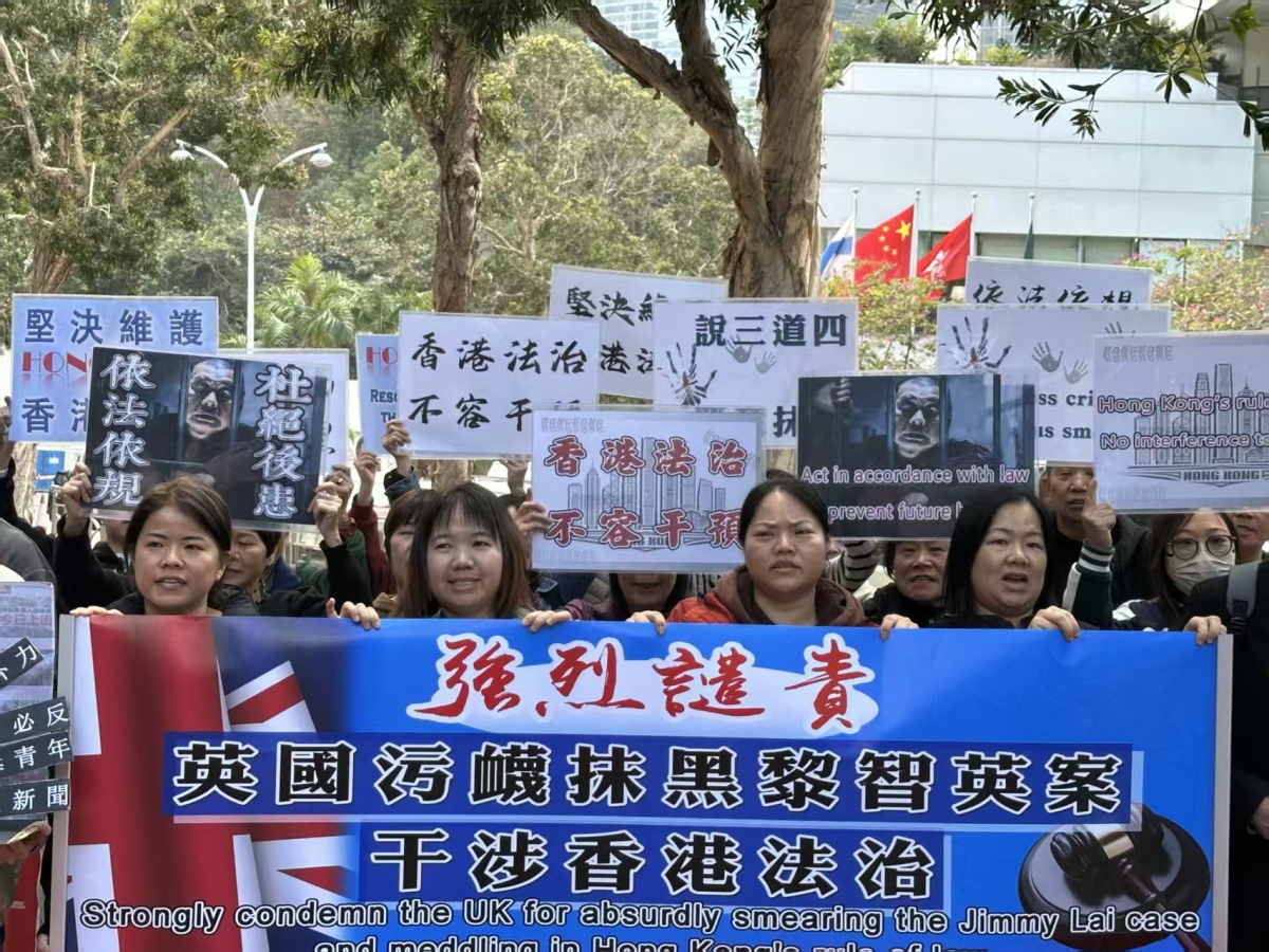 此外,亦有大批香港市民在英國駐香港總領事館集會抗議,強烈譴責英國政府汙衊抹黑黎智英案,干涉香港法治。