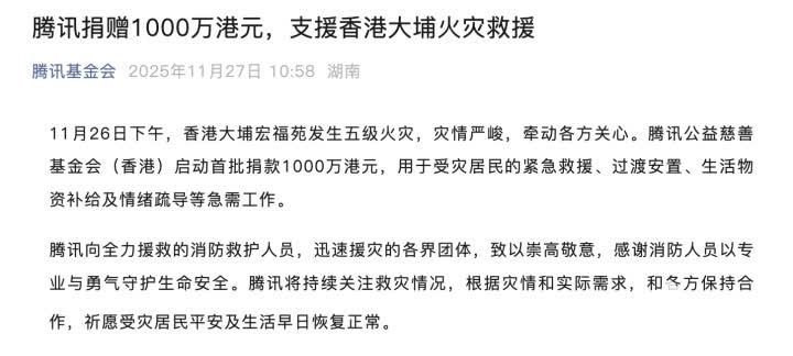 騰訊公益慈善基金會(香港)今日(27日)宣布,啟動首批捐款1000萬港元,用於受災居民的緊急救援、過渡安置、生活物資補給及情緒疏導等急需工作。騰訊向全力援救的消防救護人員及迅速援災的各界團體致以崇高敬意,感謝消防人員以專業與勇氣守護生命安全。騰訊將持續關注救災情況,根據災情和實際需求,和各方保持合作,祈願受災居民平安及生活早日恢復正常。