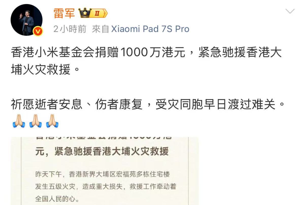 雷軍發文指,祈願逝者安息、傷者康復,受災同胞早日渡過難關。香港小米基金會指,今日上午,香港小米基金會緊急馳援1,000萬元,用於受災居民的醫療救援、緊急安置、過渡期生活救援等。此外,基金會將持續關注受災救援情況,與社會各界攜手,幫助受災同胞早日渡過難關,重返正常生活。