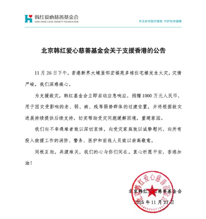 公告中,韓紅基金會亦向在火災中的不幸遇難者致以深切哀悼,向所有受災家庭致以誠摯慰問,並向不顧危險、奮戰在救援一線的消防、警務、醫護及所有前線人員表達了崇高的敬意。