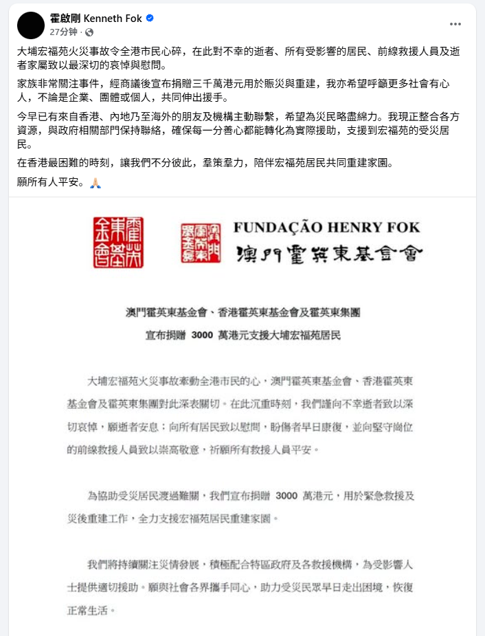 11月27日下午,澳門霍英東基金會、香港霍英東基金會及霍英東集團宣布,捐贈3,000萬元,用於緊急救援及災後重建工作,全力支援宏福苑居民重建家園。
