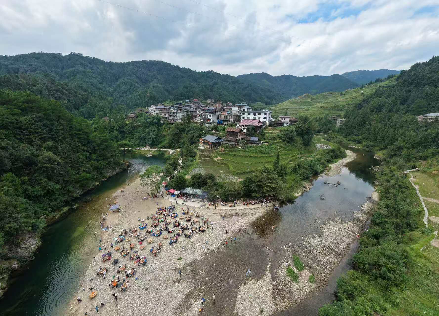 從上海趕過來體驗的汪先生,不但在碳火邊拿著烤串忙著拍照打卡,還與一幫好友加入“嗨”的隊伍,與苗家兒女一起在水邊玩水、跳舞……他們還將品嘗烤魚烤肉的百家宴桌子,擺在整朵苗寨沙灘的淺水上,好不愜意。