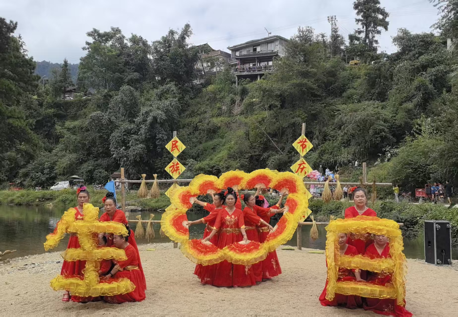 開場舞《中國范兒》率先炸響全場,苗家兒女的銀飾在陽光下閃爍,剛勁的舞步裡躍動著民族自信;移民文藝隊接唱《中國大舞臺》,高亢的嗓音唱出“山好水好人更親”的時代注腳。大屯隊的《情歌輕輕唱》如溪澗淌過心尖,唱的是山水間的浪漫,道的是鄰里間的溫情;整朵隊的《歡迎你歡迎你們的到來》則用最樸實的歌詞直抵人心:“山那邊的客人喲,苗家的米酒已溫熱,火塘邊的位置已留好……”