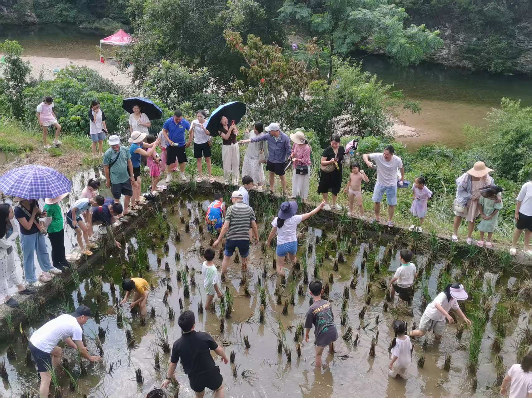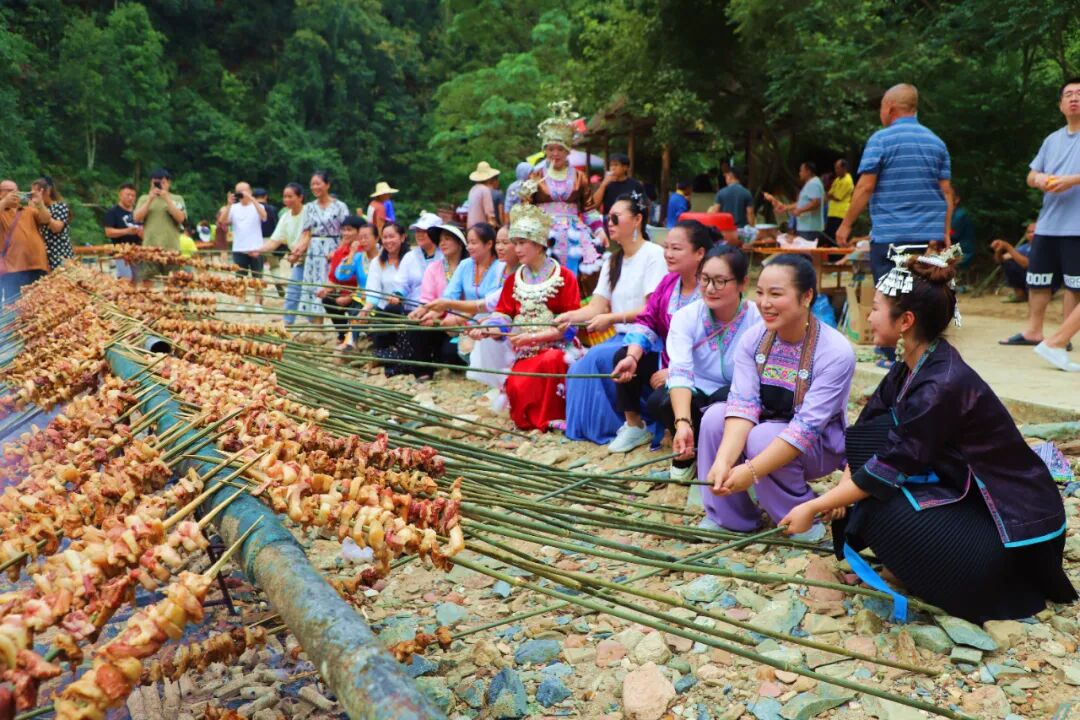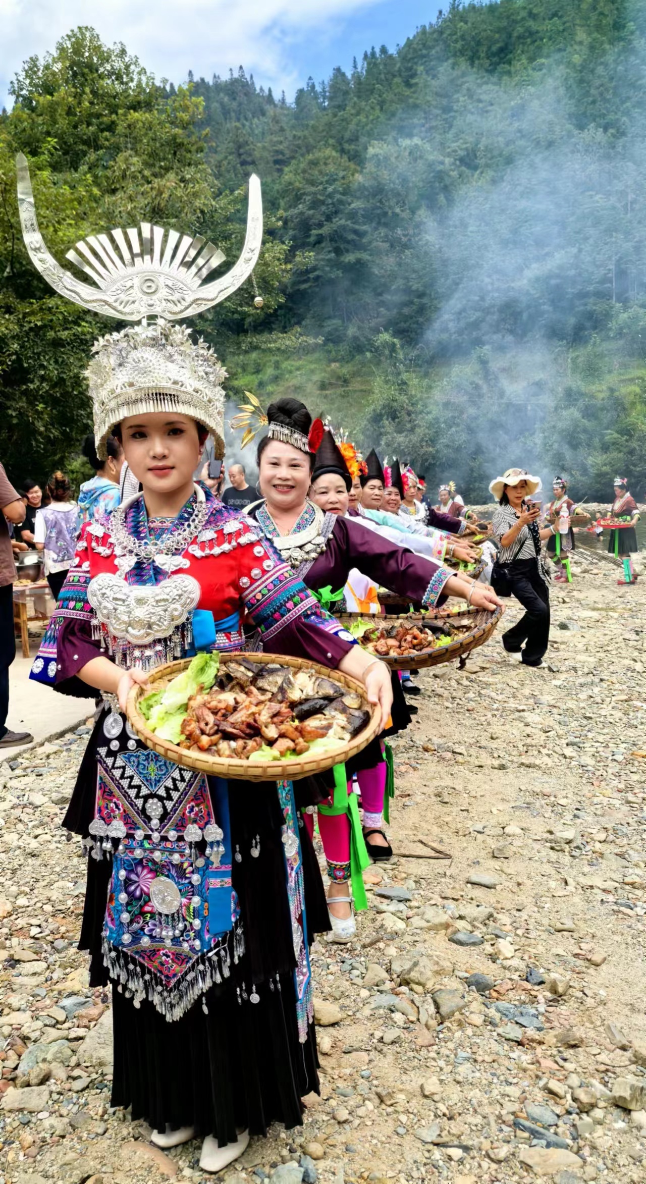 “每年的10月就是融水苗鄉的豐收季,每到這時候整朵苗寨就在沙灘上舉辦燒魚活動,熱熱鬧鬧地慶祝豐收,邀請和歡迎四面八方的朋友來做客,感受我們苗族最原生態的美食和美景。”就因為整垛苗族村民賈海燕、賈鴻燕兩姐妹(上圖右2)的這番話,柳州某幼稚園的西瓜老師(上圖右3),從柳州來到她家,換上民族服裝後,妥妥的一朵“村花”,到了晚上,西瓜老師的學生家長刷手機看到燒魚節的視頻,第二天從柳州趕過來參加活動,無獨有偶,羅城縣的小韋夫婦刷手機看到消息,第二天也從羅城縣趕到整朵沙灘,排隊買了票……