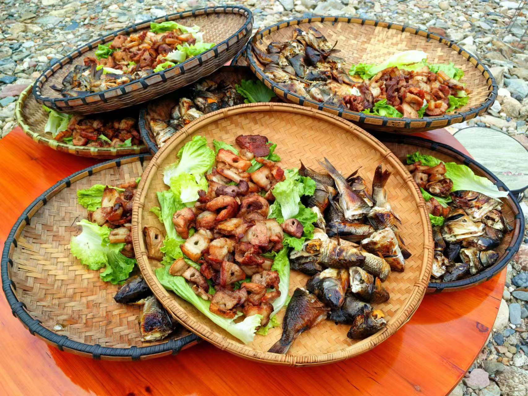 這邊的文藝演出剛落幕,那邊沙灘上的煙火氣愈發濃郁。燒魚燒肉的炭火劈啪作響,香氣裹挾著歡笑聲飄向遠方。隨後開啟的百家宴上,一盤盤金黃焦香的元寶燒魚烤肉端上桌,遊客與村民圍坐共食,談農事、話家常,鄉情在魚香中升溫。