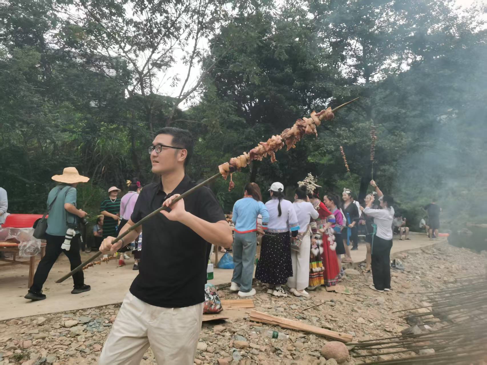 當日(10月3日)清晨,整垛苗寨的村民們就熟練地支起烤架燃起炭火,將醃制好的豬肉和剛從田裡抓上來的禾花鯉用竹子串成大串,整齊擺放在炭火上,油脂遇熱滋滋作響,香氣四溢。不少遊客也興致勃勃,挽起袖子湊到火邊,跟著村民學習翻動烤串,炭火烤出的焦香直鑽鼻腔,引得在場眾人垂涎欲滴。