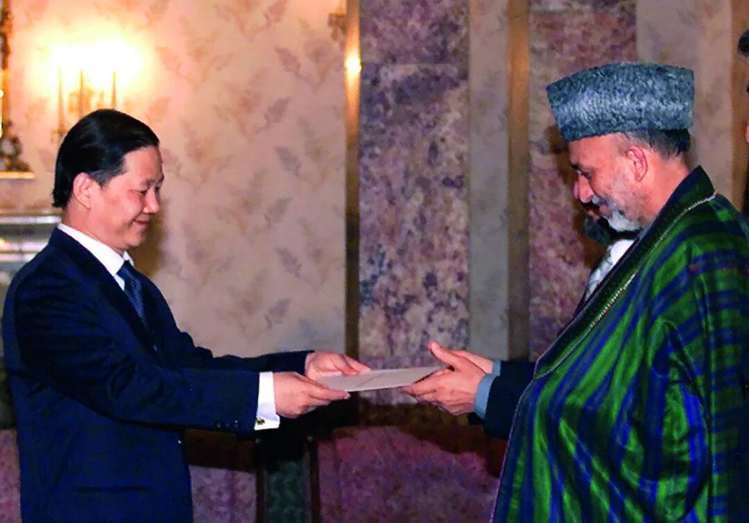 2002年5月,孙玉玺(左)向时任阿富汗临时政府主席卡尔扎伊递交国书