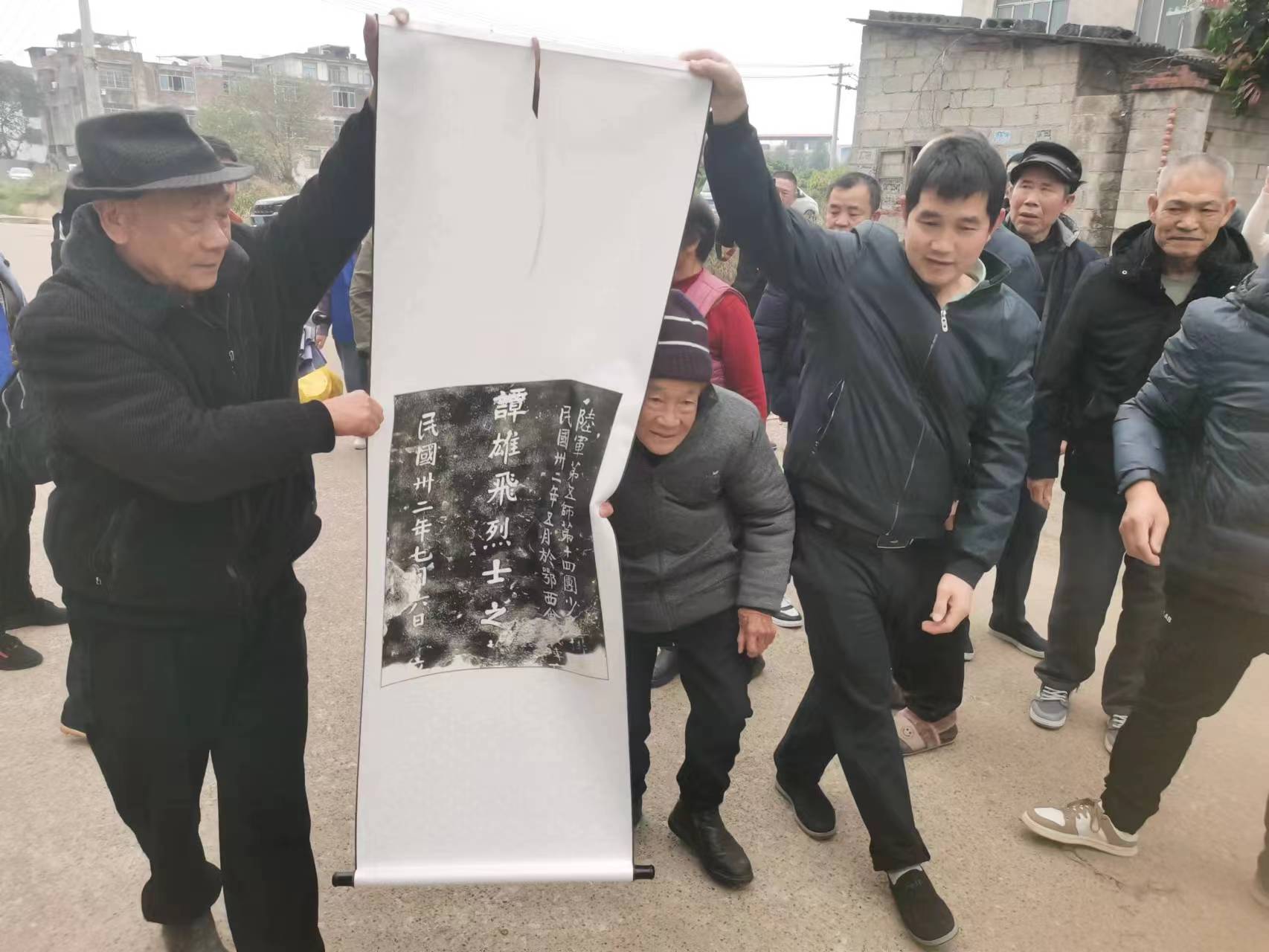 這邊,雖說柳州志願者已經統一了認識:我們就是譚雄飛的親人,我們接烈士的墓碑拓畫,但是志願者楊柳萍還是與申立新、鐘蓉、黃柳宣幾位志願者再次來到譚家屯,譚文海、譚文軍、譚文華、譚文忠、譚文芳、譚建軍、譚新波、譚光倫、譚春華、譚新勇、譚新洪、譚榮華、譚炳榮、譚小滿、譚建國等譚家理事商量後決定:既然是譚家的抗日烈士,我們譚家屯的人也象親人一樣把它迎回譚家……