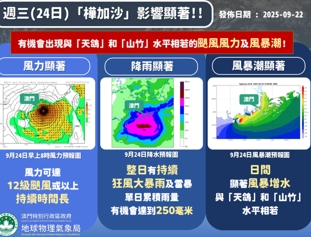 廣東省氣象臺預測,23日至25日,廣東海面及陸地將遭遇嚴重風雨浪潮影響。颱風中心經過海域風力可達14-17級、陣風17級以上,廣東南部地區將現大暴雨,珠江口附近或因強風、暴雨與天文大潮疊加引發海水倒灌。香港天文臺將於22日中午發佈一號戒備信號,澳門氣象局警告,24日淩晨至早晨颱風可能近距離掠過珠江口,風力達12級颶風級以上,單日降雨量或超250毫米,風暴潮威脅堪比2017年超強颱風“天鴿”。
