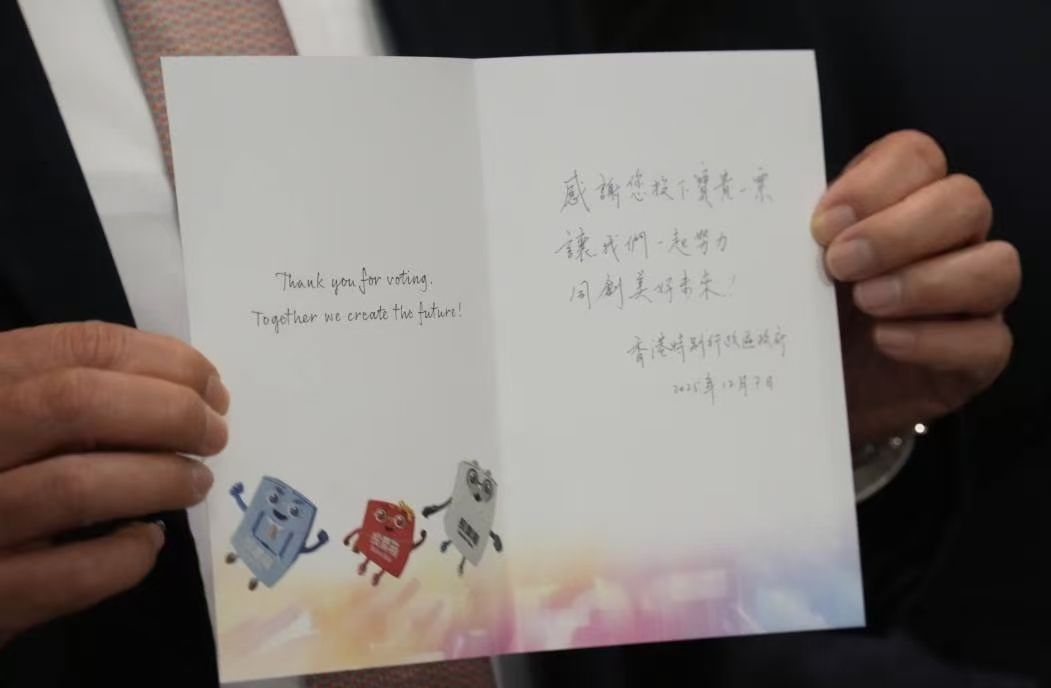 陳國基說,為感謝市民參與立法會選舉,選民於投票站完成投票後,將獲派一張心意謝卡。此謝卡由香港生成式人工智能研發中心團隊運用生成式AI技術設計,並由政府新聞處及政府物流服務署製作印刷。封面有選舉吉祥物「票箱寶寶」-----藍小寶、紅小寶及白爺爺,寓意全社會攜手努力,共創香港美好未來。