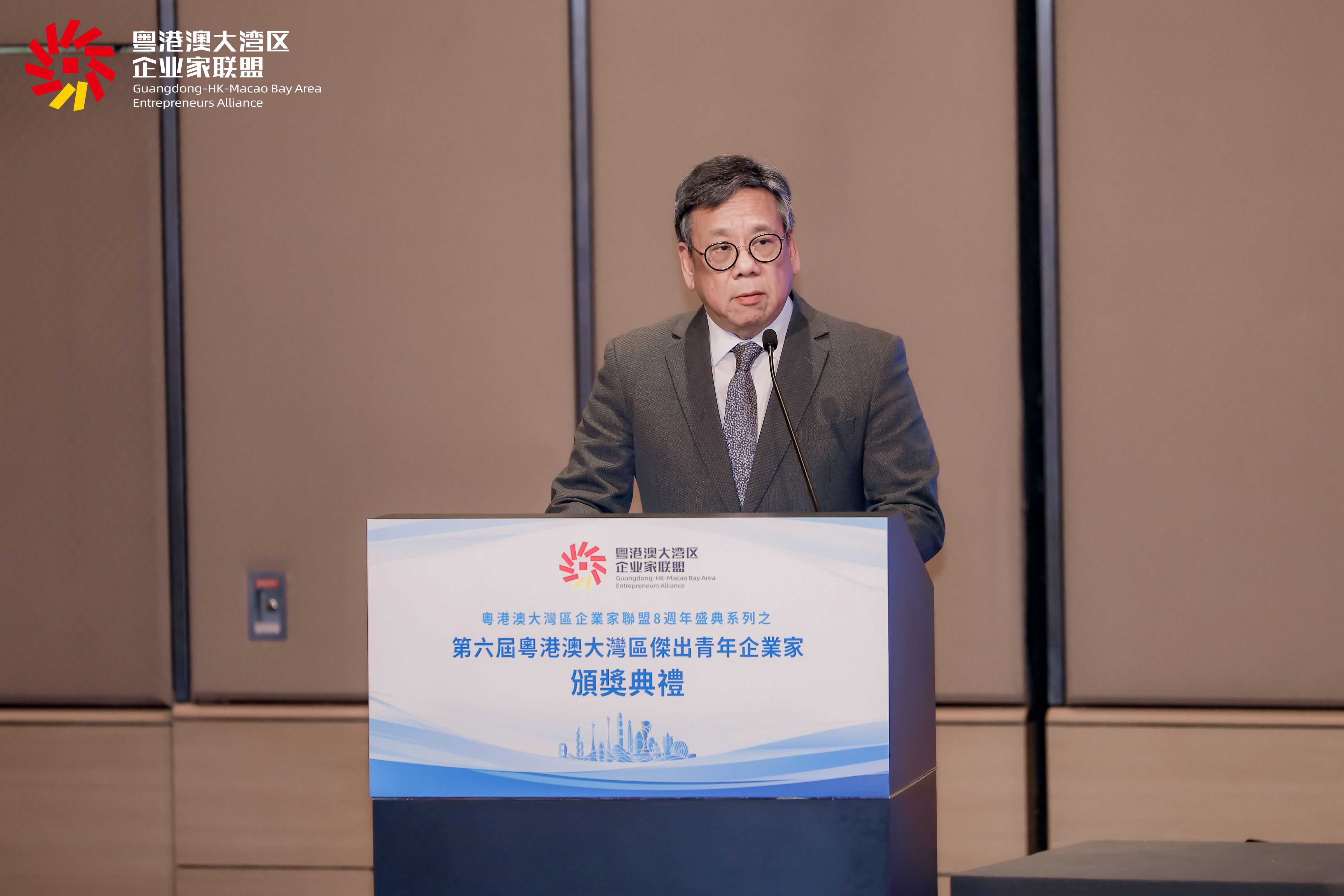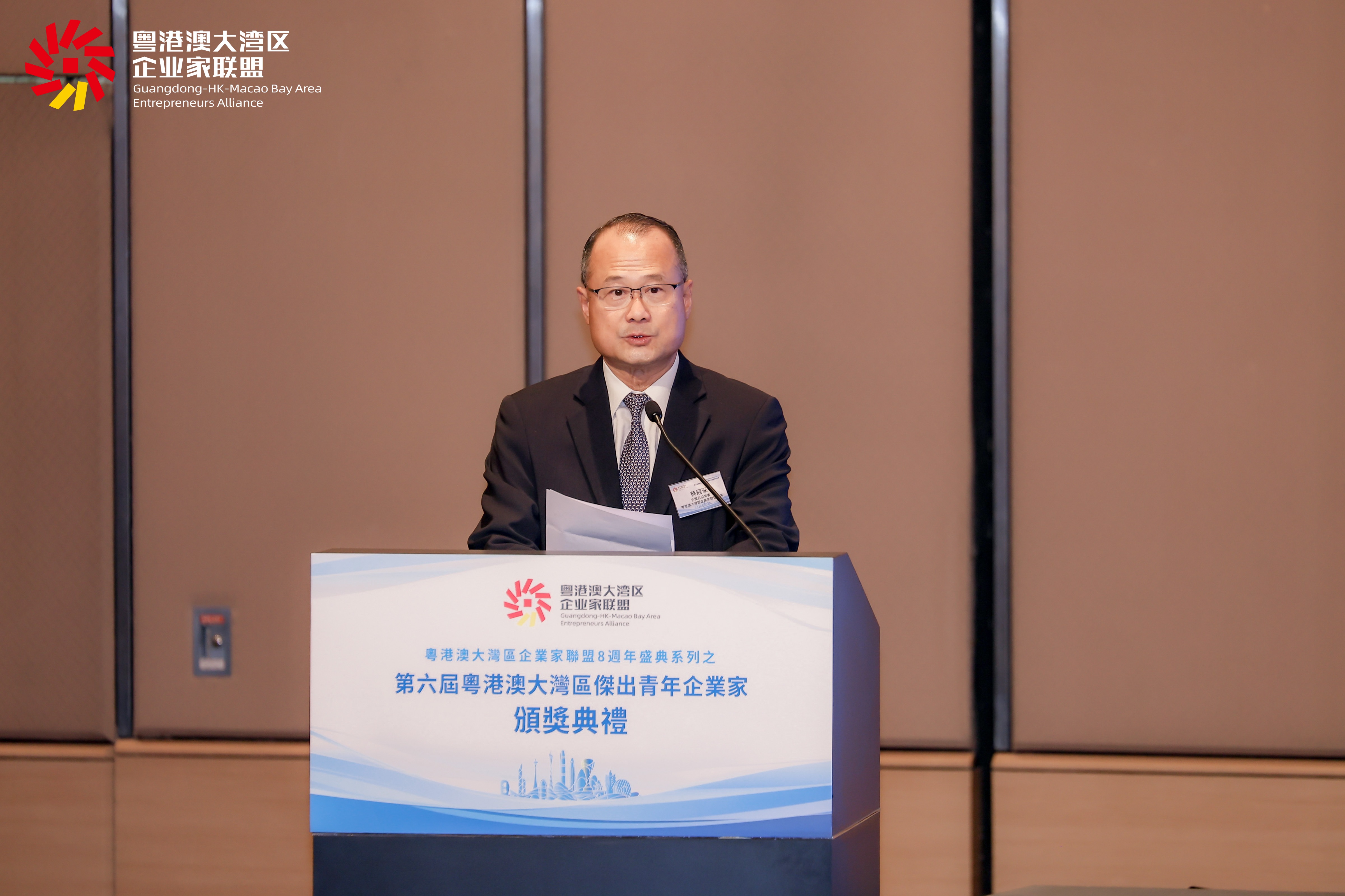 商務及經濟發展局局長丘應樺在致辭中祝賀所有獲獎青年企業家,讚揚他們是推動粵港澳大灣區發展的核心力量。他指出,大灣區人口超過8,700萬,生產總值逾14.5萬億元人民幣,在國家戰略支持下,區內人流、物流、數據流及資金流高效互通,合作不斷深化。香港正積極轉型產業結構,透過與大灣區協同發展新興產業,實現互惠共贏。他提及《施政報告》中「香港國際機場東莞空港中心」項目,體現大灣區合作成果。政府將推出「青年人才培養計劃」等措施,助力青年拓展國際視野,貢獻國家與香港。他期望未來湧現更多大灣區傑出青年企業家,共同推動高質量發展。