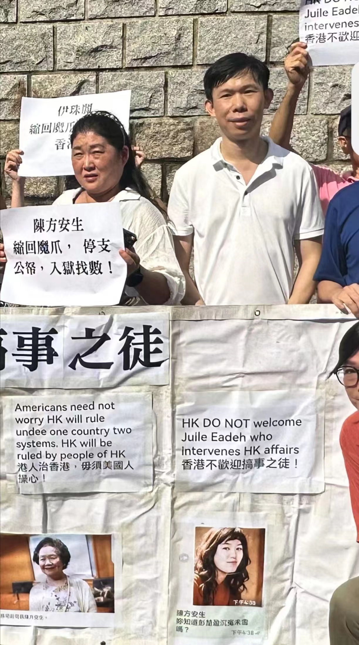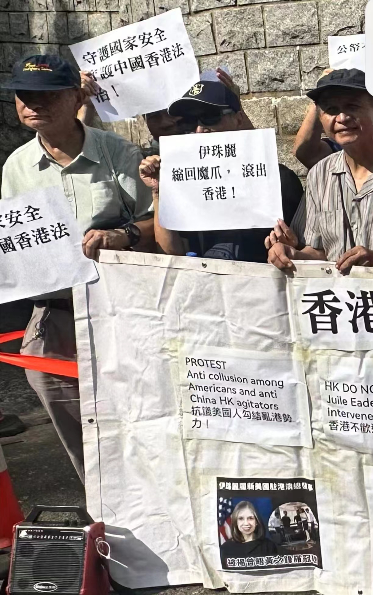 香港大中華通訊社電 美國駐港澳總領事伊珠麗上任後,高調會見香港前政務司司長陳方安生、民主黨前主席劉慧卿等人士,此舉引發香港社會民眾的憤慨,事後多批市民團體前往美國駐港澳總領事館外抗議,要求伊珠麗停止亂港行為。