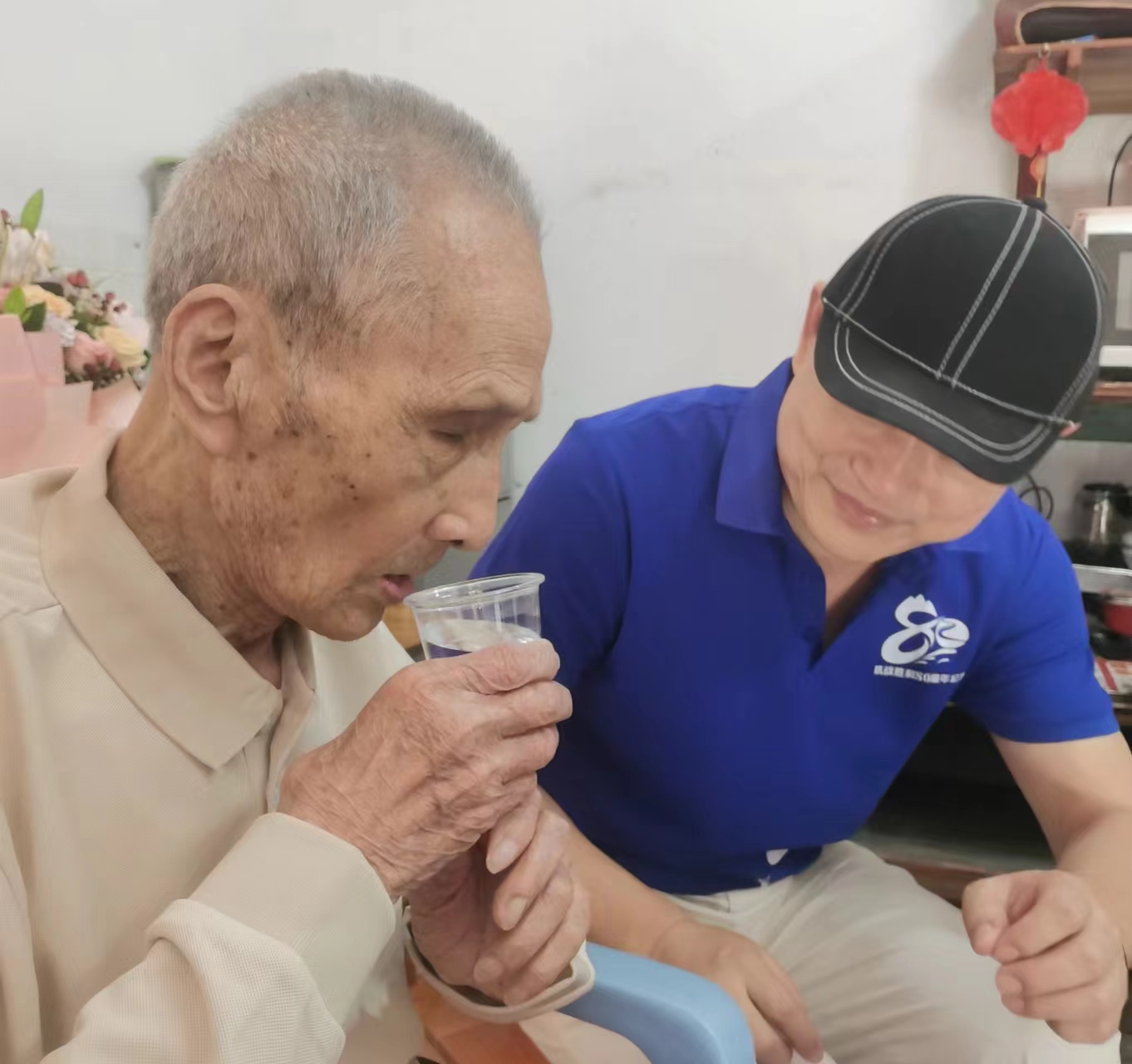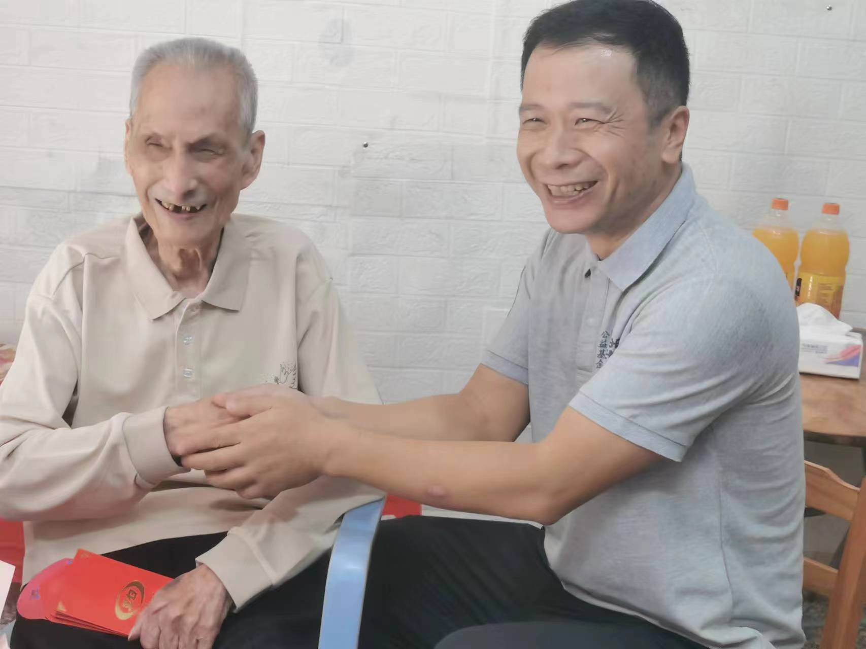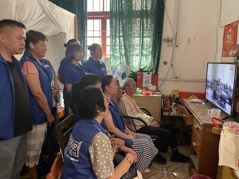 “爺爺,我們又來看您啦!”門剛推開,志願者們便熟稔地喚著。老人扶著門框緩緩起身,佈滿皺紋的眼角漾開笑意。待他被攙至客廳坐定,志願者、柳州民革成員申立新舉起手機,螢幕裡立刻柳州志願者團隊的其他成員,包括遠在加拿大的盧老師、麥克等人的笑臉----“余爺爺,中秋快樂!”“余爺爺,生日快樂!”“想您嘞!”101歲的餘忠凝視著螢幕,乾瘦的右手突然抬起,五指併攏,手臂與眉齊平。這個跨越山海的標準軍禮,讓視頻兩端的人都紅了眼眶。