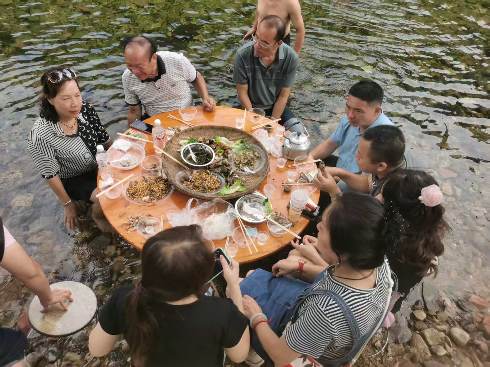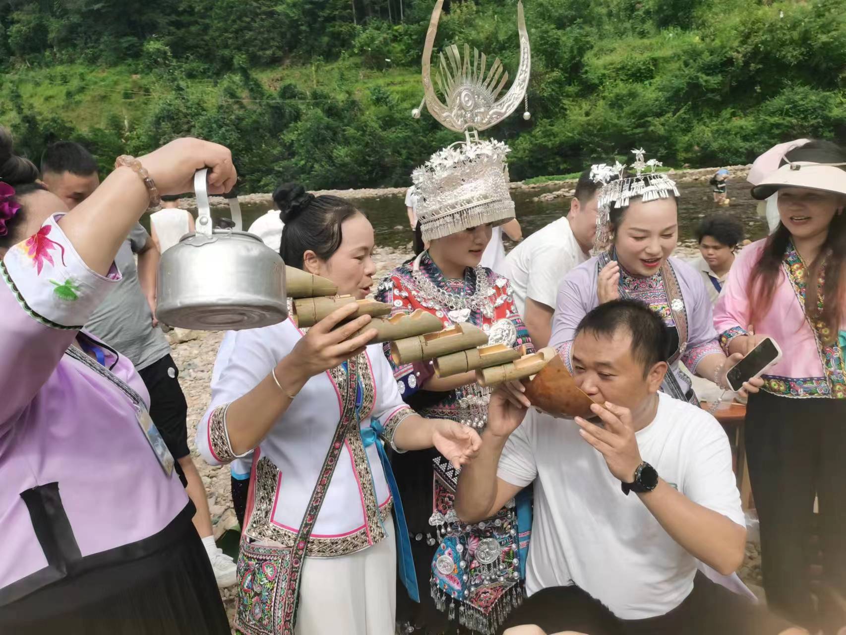 從上海趕過來體驗的汪先生,不但在碳火邊拿著烤串忙著拍照打卡,還與一幫好友加入“嗨”的隊伍,與苗家兒女一起在水邊玩水、跳舞……他們還將品嘗烤魚烤肉的百家宴桌子,擺在整朵苗寨沙灘的淺水上,好不愜意。