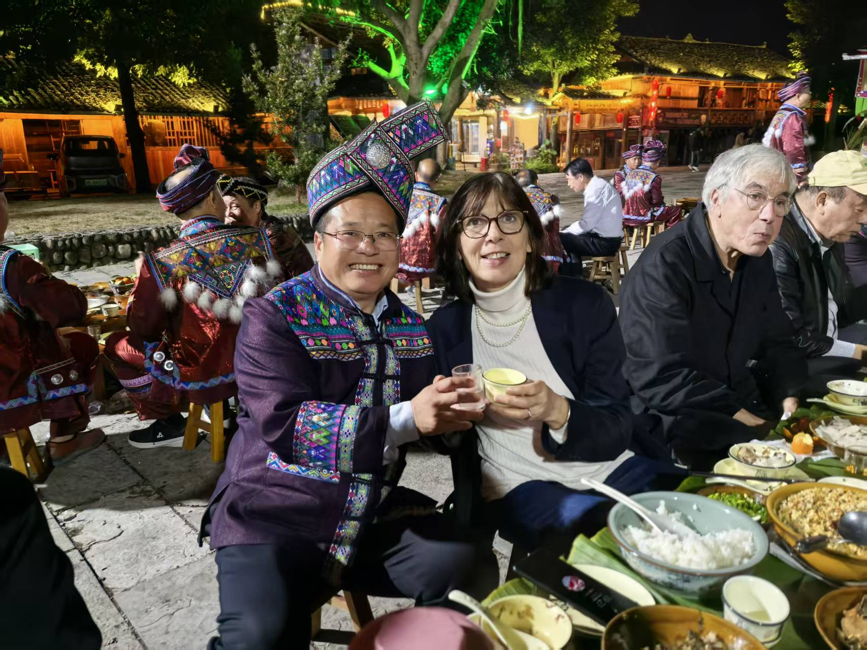 夜幕降臨,長桌宴開席,米酒飄香,歌聲繞梁。苗族同胞真誠敬酒,讓外國客人卸下疏離,慷慨直言