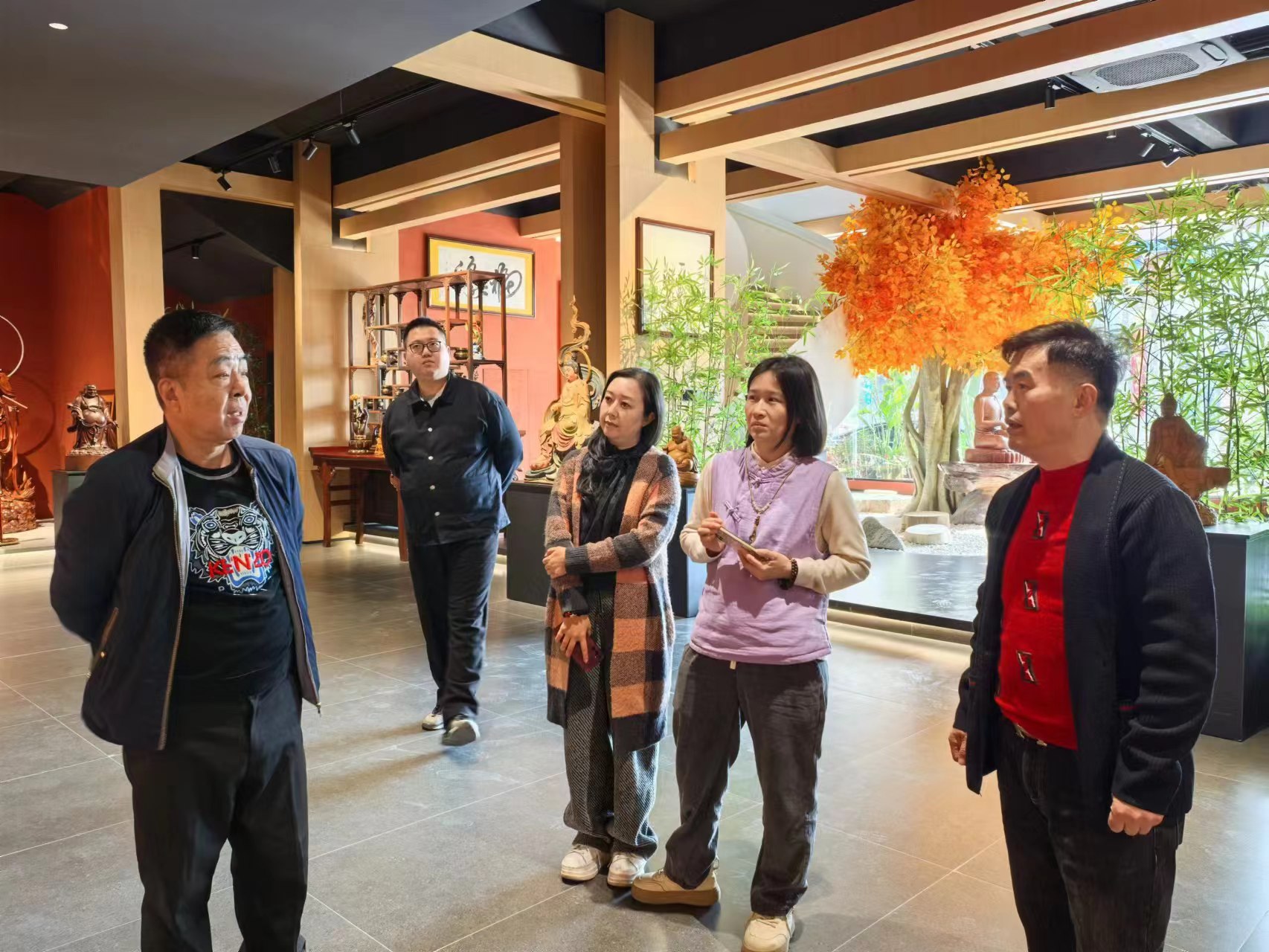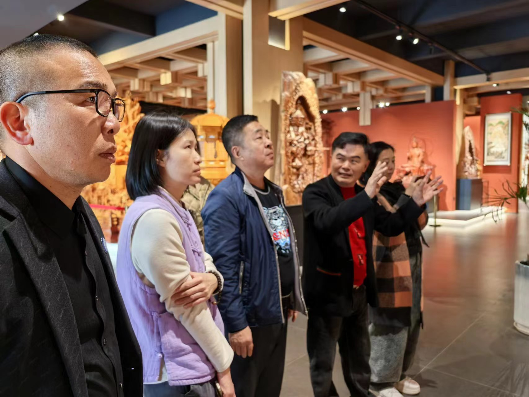 在蒲洋藝術館,考察團與國家級非物質文化遺產莆田傳統木雕技藝傳承人、第八屆中國工藝美術大師吳文忠展開深度交流。吳文忠大師向考察團介紹了莆田木雕的歷史傳承、工藝特色與當代創新,展示了沉香木雕、佛像雕刻等精品力作,分享了自己深耕木雕技藝四十餘年的創作心得與傳承經驗。作為莆田木雕行業的領軍人物,吳文忠大師的作品屢獲國家級金獎,其創作的《華嚴蓮池會》《一葉觀音》等作品更是亮相上海世博會,讓考察團近距離領略了莆田傳統木雕的精湛技藝與文化魅力,對莆陽傳統工藝的傳承發展成果給予高度評價。